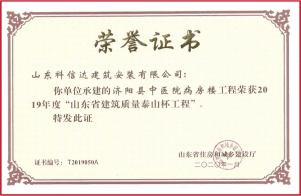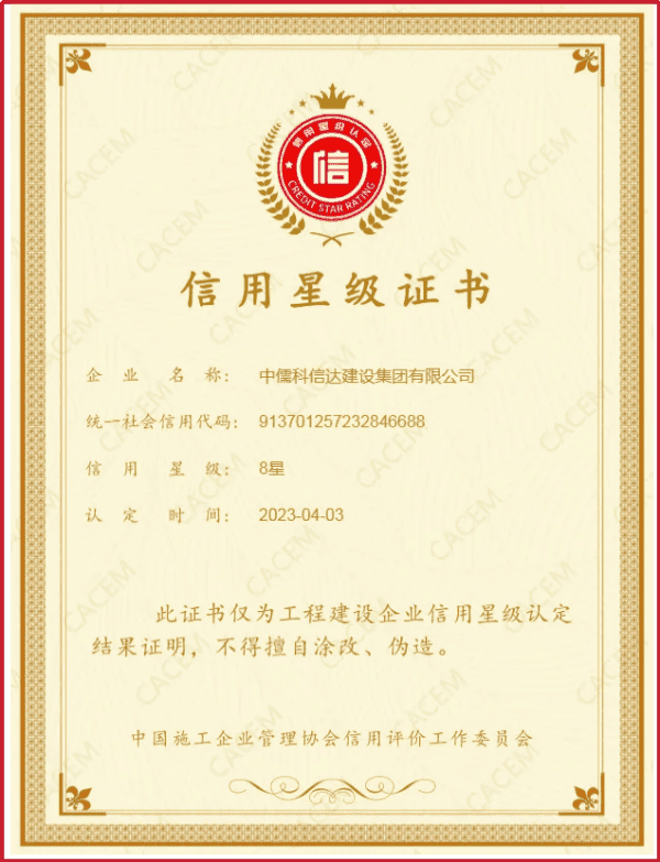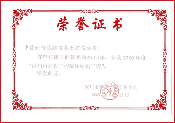 科信达以“质量求生存,以信誉谋发展”作为企业发展纲领,打造铁军建设,秉承逢优必创的信念,公司成立以来先后获得众多国家级、省级、市级等各类奖项。如部级“AAA”施工企业、泰山杯、省级“科技示范工程”、泉城杯、结构杯、省级文明工地、市级文明工地、市级信用等级AAA级企业、诚信经营示范单位AAA级企业、企业资信等级AAA级企业、重质量守信用AAA级企业。
