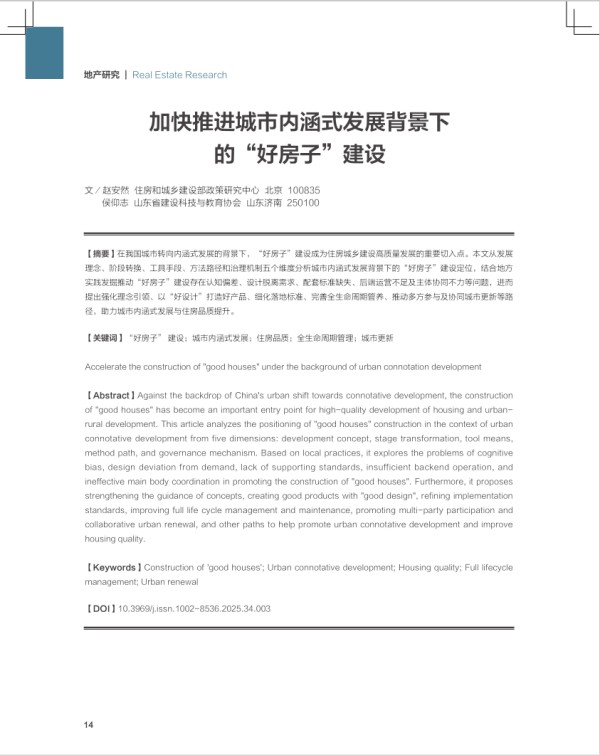 摘要:在我国城市转向内涵式发展的背景下,“好房子”建设成为住房城乡建设高质量发展的重要切入点。本文从发展理念、阶段转换、工具手段、方法路径和治理机制5个维度分析城市内涵式发展背景下的“好房子”建设定位,结合地方实践发掘推动“好房子”建设存在认知偏差、设计脱离需求、配套标准缺失、后端运营不足及主体协同不力等问题,进而提出强化理念引领、以 “好设计”打造好产品、细化落地标准、完善全生命周期管养、推动多方参与及协同城市更新等路径,助力城市内涵式发展与住房品质提升。