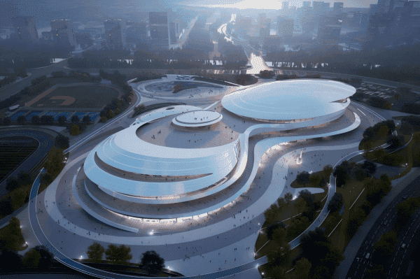 该项目占地23.85万㎡,总建筑面积16.13万㎡,建安费约15亿元,计划2025年6月底竣工。项目包含1万座席的大型甲级体育馆、全民健身中心、游泳馆及游园式体育公园等设施。主馆与游泳馆共用大底盘地下室,采用防震缝分隔,主馆建筑面积15万㎡,地上5层、地下1层,采用钢筋混凝土框架结构,体育馆屋盖为跨度175m×120m的双向正交钢桁架结构,具备承接大型赛事的能力。游泳馆设计为椭球体,屋盖结构为钢网格混凝土组合壳体结构,营造独特的运动橱窗式空间体验。设计以烟台“山耸云中,岛围城绕”的城市印象为灵感,形成“团云、层云、低云”漂浮于绿岛般体育公园的整体布局,体现城市文化特色。项目融合文、体、商、旅功能,打造开放式活力空间,为全民健身和城市发展注入新动能。建设单位为烟台八角湾科创发展有限公司,施工单位为中铁十局集团有限公司。