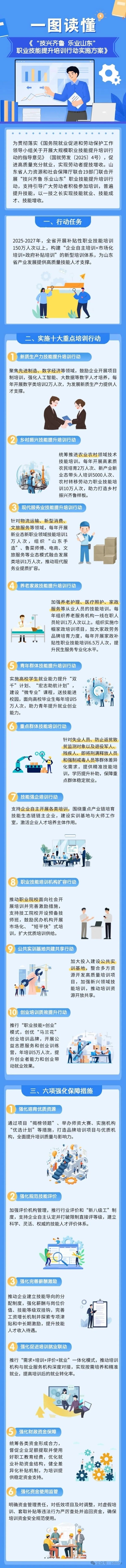 为贯彻落实《国务院就业促进和劳动保护工作领导小组关于开展大规模职业技能提升培训行动的指导意见》(国就劳发〔2025〕4号),促进高质量充分就业,实现劳动者提技增收。现就开展“技兴齐鲁乐业山东”职业技能提升培训行动制定以下实施方案。
