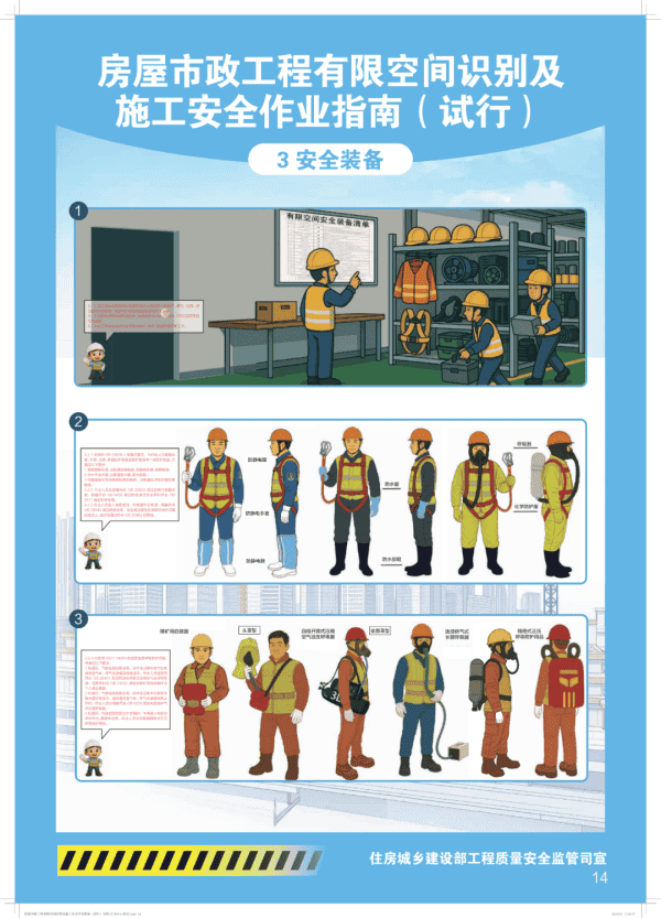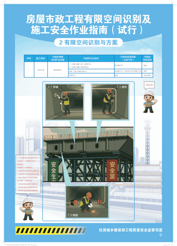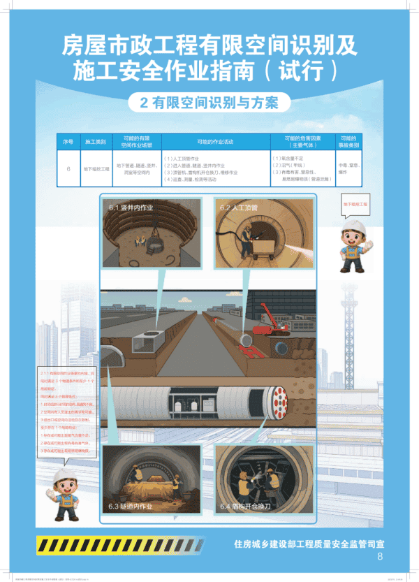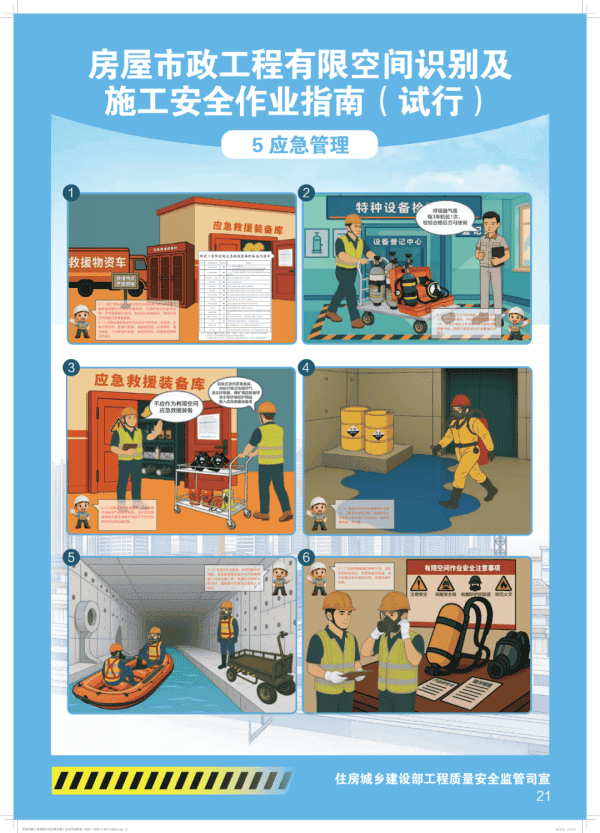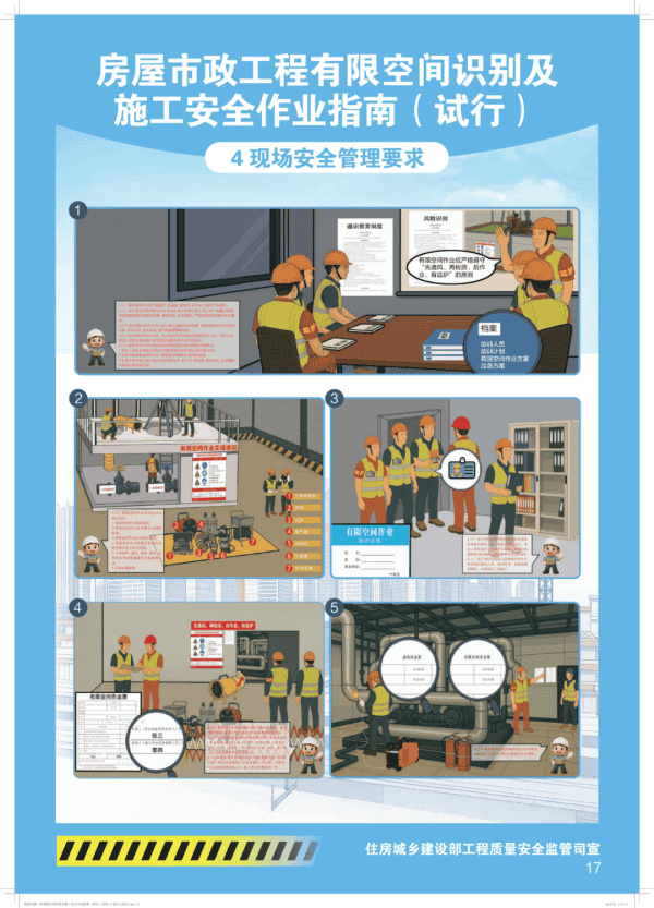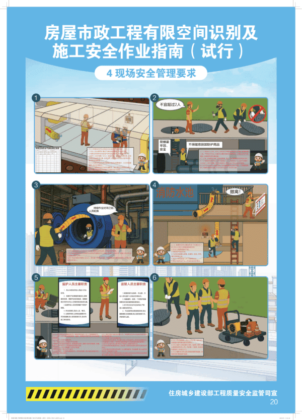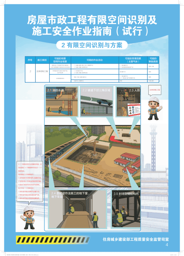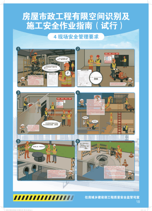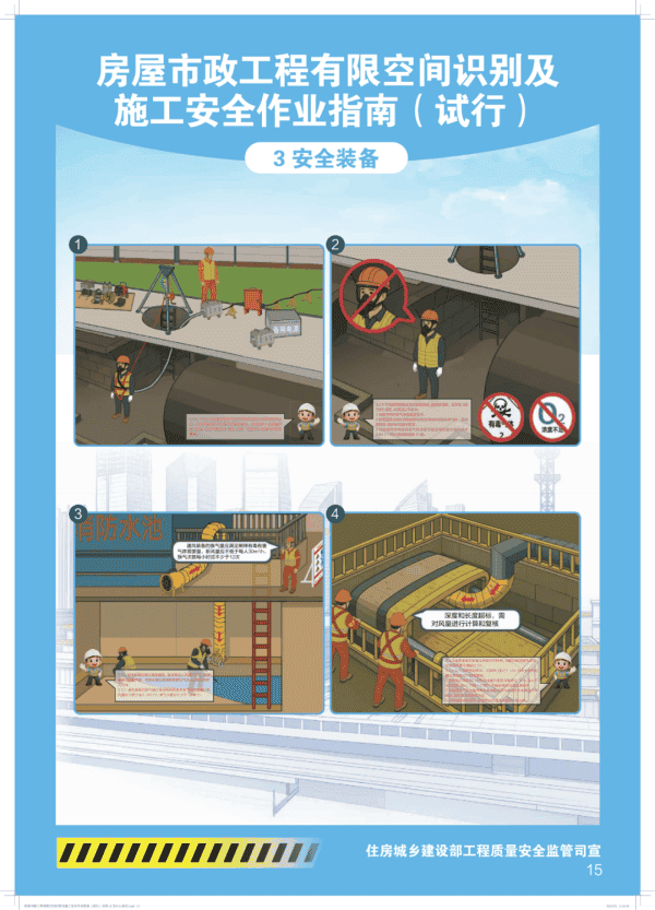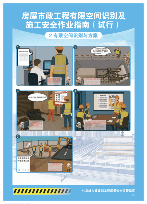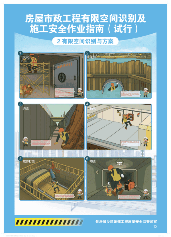 为进一步做好房屋市政工程安全生产管理工作,提高有限空间作业风险识别、安全管控和应急处置能力,住房城乡建设部制定了《房屋市政工程有限空间识别及施工安全作业指南(试行)》,并组织专家编制宣传画册和海报,已由中国建筑工业出版社正式出版发行,供各单位组织学习使用。