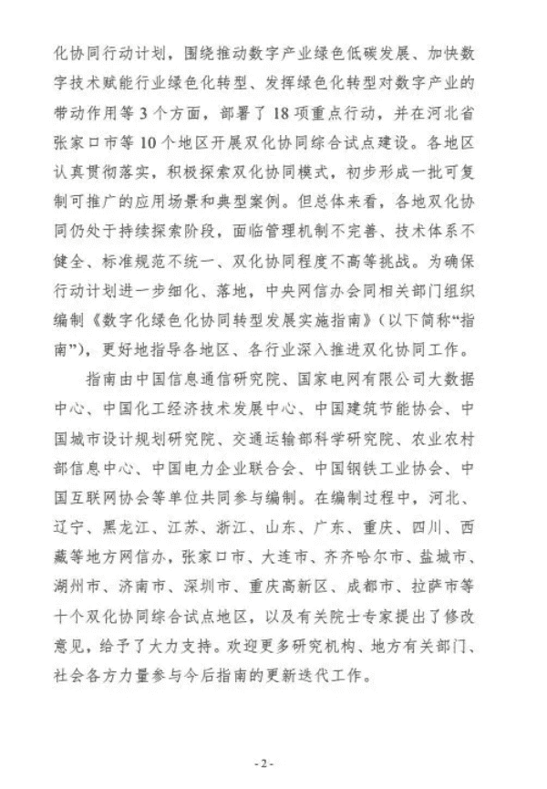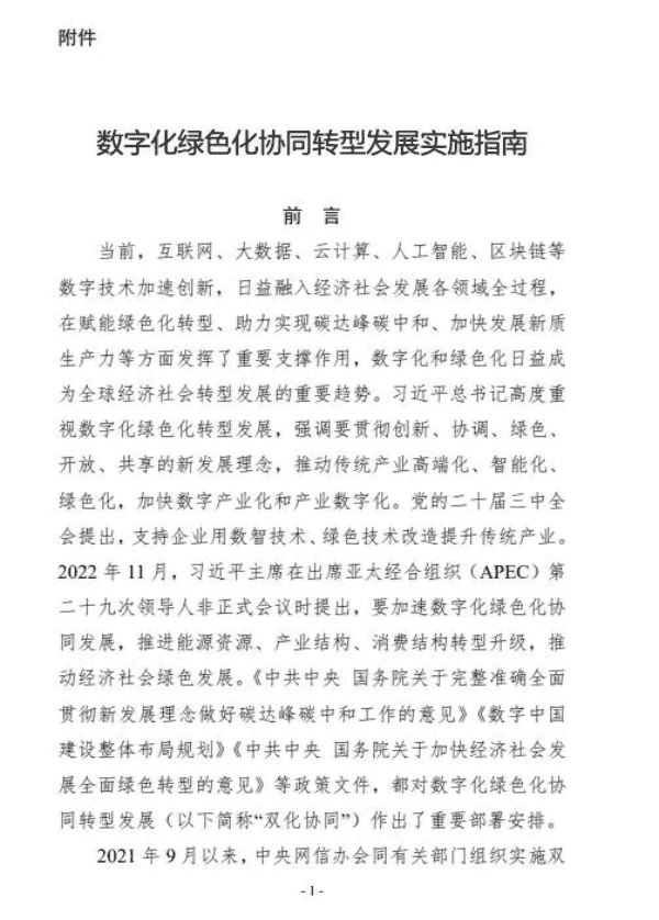 数字化和绿色化是全球经济社会转型发展的重要趋势。为深入贯彻落实党的二十届三中全会精神,加快数字化绿色化协同转型发展(以下简称“双化协同”),推动互联网、大数据、人工智能、第五代移动通信(5G)等新兴技术与绿色低碳产业深度融合,利用数智技术、绿色技术改造提升传统产业,中央网信办秘书局、国家发展改革委办公厅、工业和信息化部办公厅、自然资源部办公厅、生态环境部办公厅、住房城乡建设部办公厅、交通运输部办公厅、农业农村部办公厅、市场监管总局办公厅、国家数据局综合司联合印发《数字化绿色化协同转型发展实施指南》(以下简称《实施指南》)。