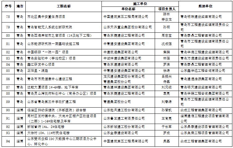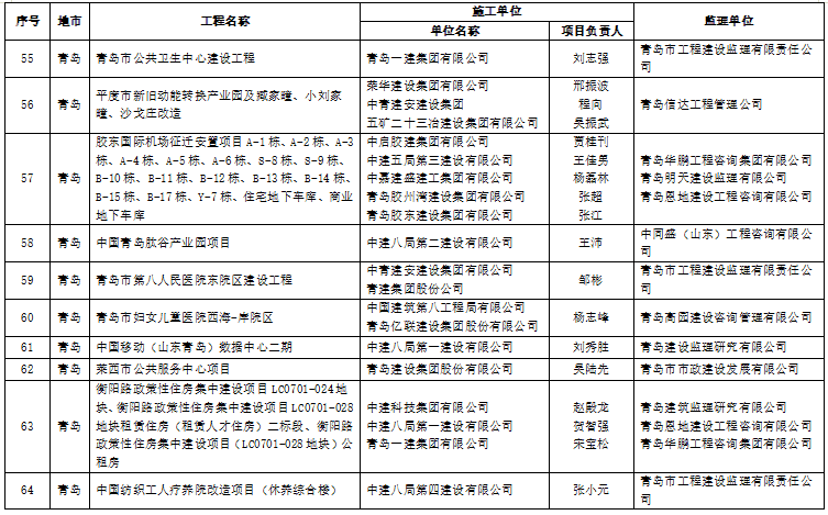 20 | 青岛 | 双创小镇(园区)基础设施配套工程 | 中建新疆建工(集团)有限公司 | 杨佳园 | 青岛华鹏工程咨询集团有限公司 |