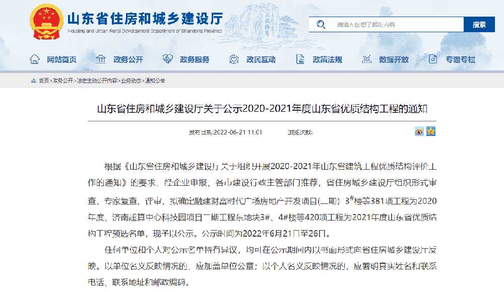 山东省住房和城乡建设厅关于公示2020-2021年度山东省优质结构工程的通知