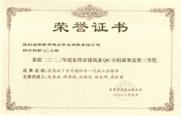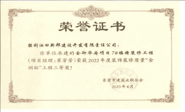 公司于2004年通过国家ISO9001质量管理、ISO14001 环境管理、OHSMS28001职业健康安全管理三项体系认证;2020年获评“水利建设市场主体信用评价AAA ”;2018年获评水利部“水利安全生产标准化一级单位 ”。公司连年被评为山东省“重合同守信用 ”“A级纳税信用 ”企业、东营市“优秀施工企业 ”、胜利油田“十佳安全承包商 ”;公司施工的项目也多次被评为省市“安全文明工地 ”“优质结构 ”、东营市“金洲杯 ”、胜利油田“标准化工地 ”等称号。