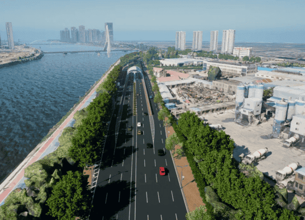 (沿风河快速路东延工程:位于青岛市黄岛区海洋高新区,是连接青岛西海岸新区与周边地区的重要通道,也是促进城市经济发展的重要基础设施。南岸全长1928米为城市主干路,北岸全长1370米,为城市次干路。)