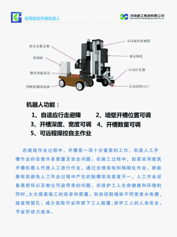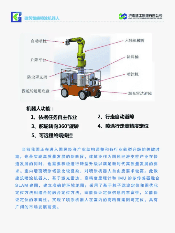 公司以产业园为依托,创新探索智能装备+劳务建筑业新模式。以绿色、低碳、智能为发展理念,把科技创新放在首位,在建筑机器人研发方面走在前列,目前研发的建筑喷涂机器人二代已下线,力争年底前进入工程试用。公司技术中心获批济南市“一企一技术”研发中心,为促进智能建造与绿色建筑融合发展,正积极筹建济南市建筑机器人及智能建造重点实验室。