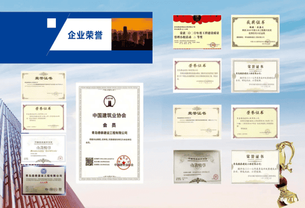 青岛德泰建设工程有限公司成立于2001年8月6日,是一家综合性施工企业,连续多年被评为全国优秀施工企业、青岛市优秀建筑业企业、青岛市建筑业协会理事单位、青岛市企业信用协会会员单位、中国建筑装饰协会会员单位。具有建筑工程施工总承包壹级;建筑装修装饰工程专业承包壹级;防水防腐保温工程、市政公用工程施工总承包贰级;地基基础工程专业承包贰级资质。主要从事建筑工程施工、建筑机具租赁、市政工程施工、土石方工程施工、装饰装修工程施工、钢结构工程施工、钢结构加工、机械加工、建筑防水工程施工、地基基础工程施工、机电工程施工、园林绿化工程施工、防水防腐保温工程施工、货物及技术进出口。