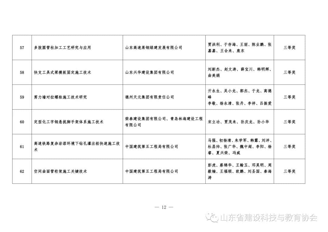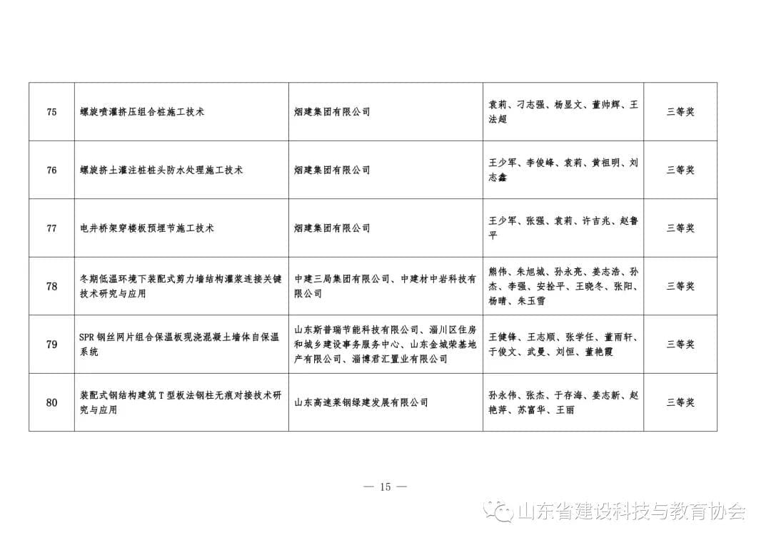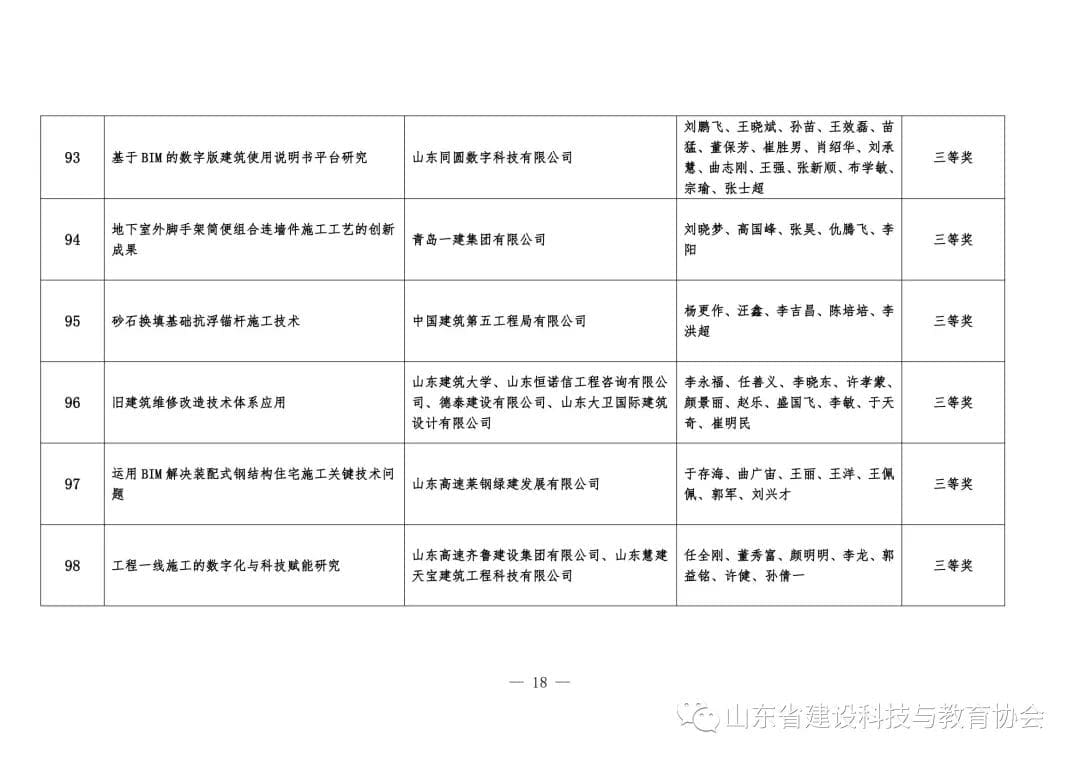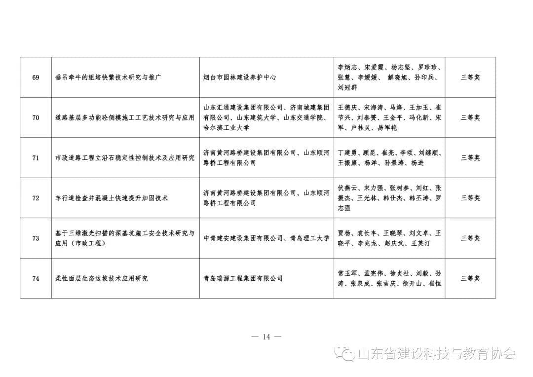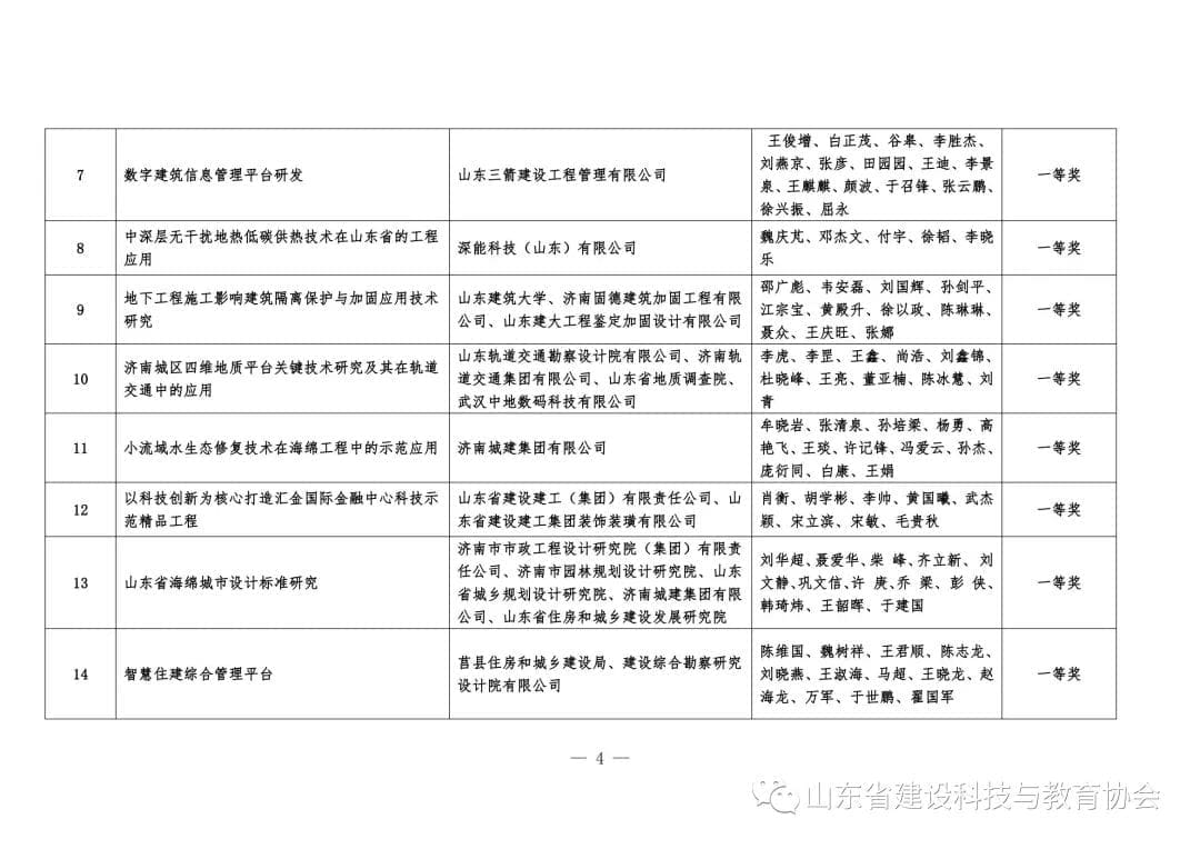 为进一步推动全省建设科技创新,加快科技成果转化,省建设科技与教育协会联合省建设工会组织开展了2021年度省山东省建设科技创新成果竞赛活动。按照《关于开展山东省建设科技创新成果竞赛的通知》、《山东山东省建设科技创新成果竞赛办法(试行)》规定,经审查、评审、公示,确定“济南城区四维地质平台关键技术研究及其在轨道交通中的应用”等14项成果为一等奖,“球幕影院穹顶施工技术研究”等36项成果为二等奖,“涂覆抗车辙防滑路面新技术研究与应用”等57项成果为三等奖,“高品质室内环境保障体系及关键技术集成”等31项成果为优秀奖。现予公布。
