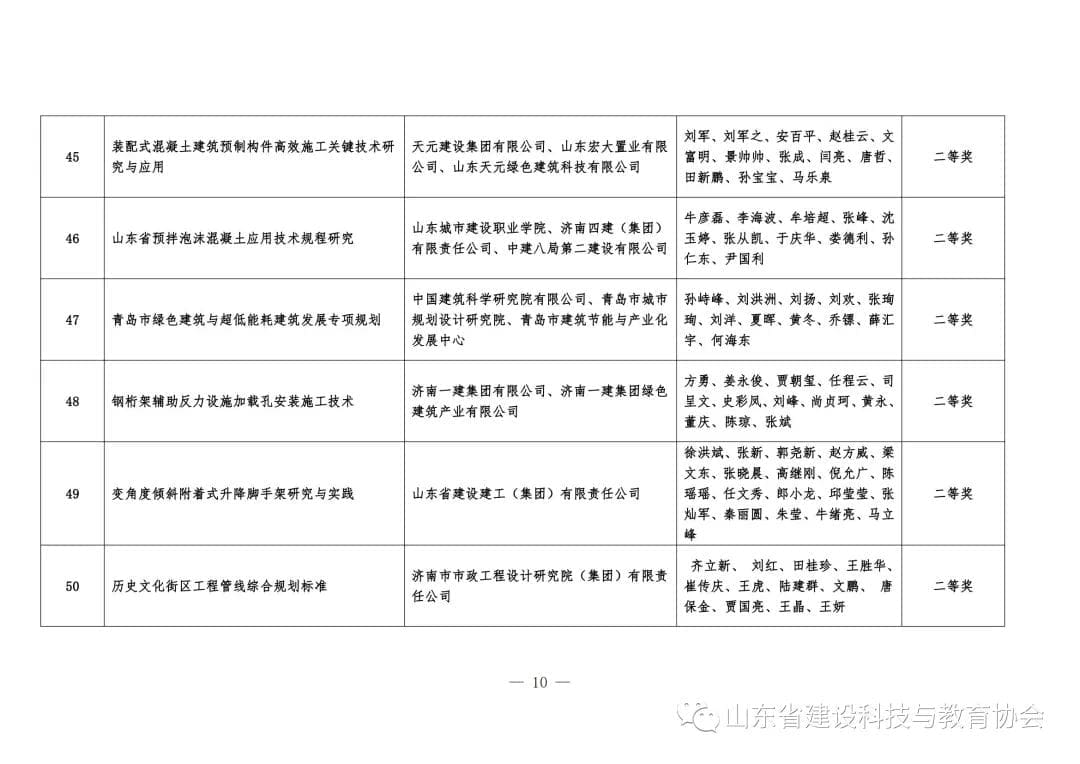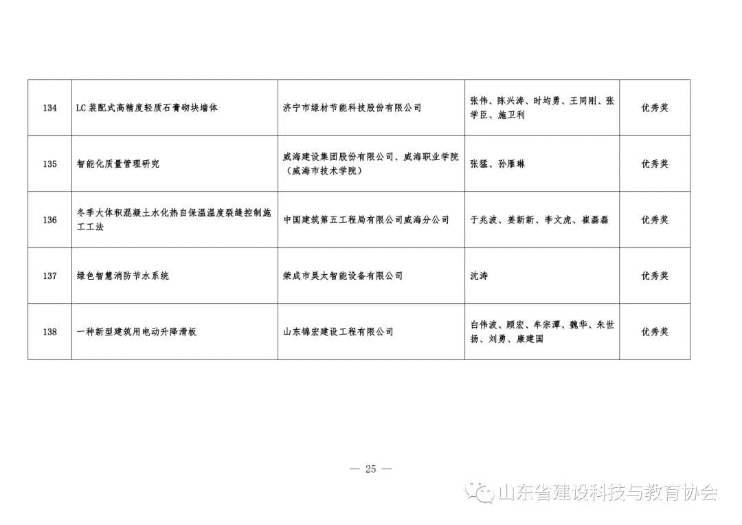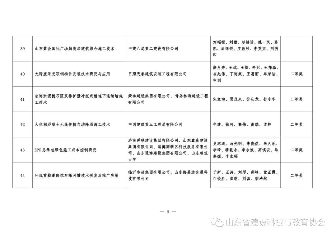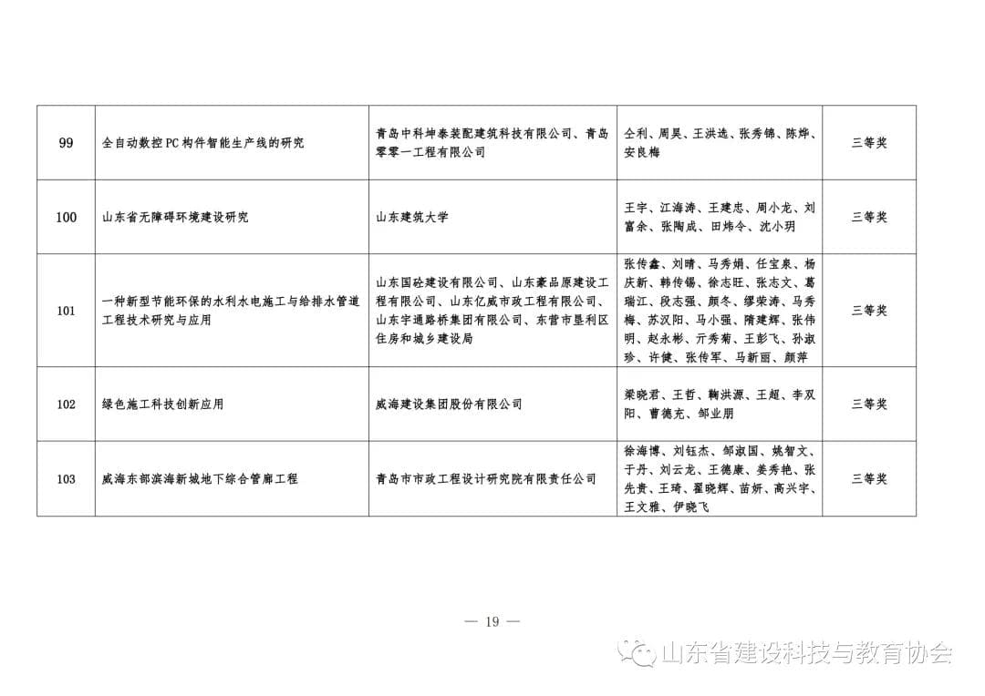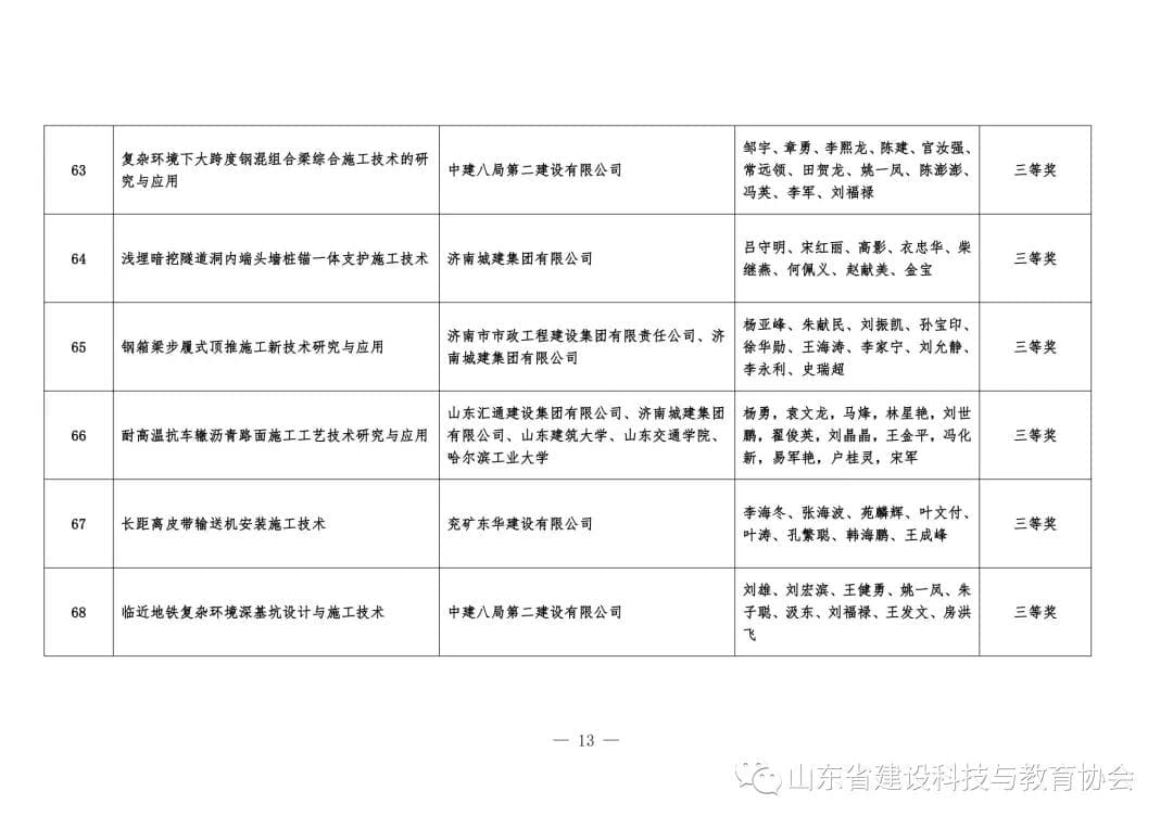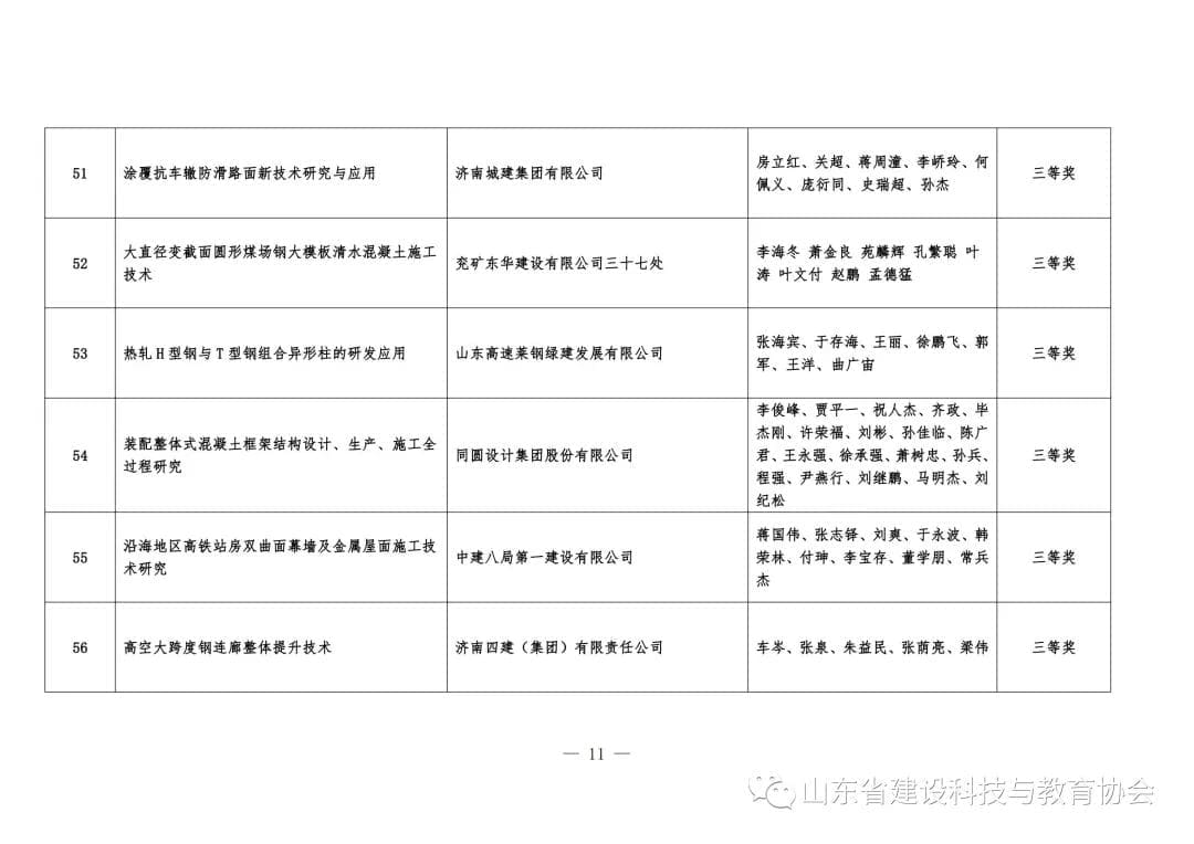 为进一步推动全省建设科技创新,加快科技成果转化,省建设科技与教育协会联合省建设工会组织开展了2021年度省山东省建设科技创新成果竞赛活动。按照《关于开展山东省建设科技创新成果竞赛的通知》、《山东山东省建设科技创新成果竞赛办法(试行)》规定,经审查、评审、公示,确定“济南城区四维地质平台关键技术研究及其在轨道交通中的应用”等14项成果为一等奖,“球幕影院穹顶施工技术研究”等36项成果为二等奖,“涂覆抗车辙防滑路面新技术研究与应用”等57项成果为三等奖,“高品质室内环境保障体系及关键技术集成”等31项成果为优秀奖。现予公布。