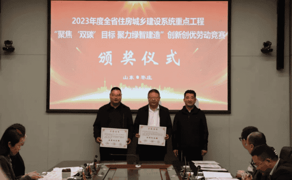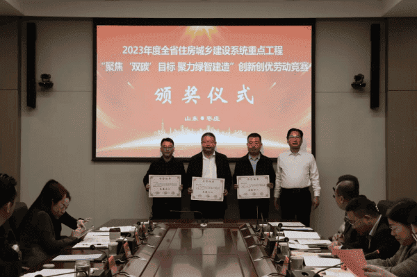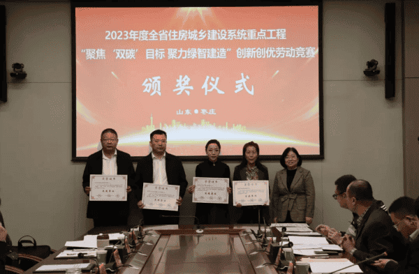 会议同期,为枣庄市获得2023年度全省住房城乡建设系统重点工程“聚焦‘双碳’目标 聚力绿智建造”创新创优劳动竞赛荣誉的先进集体、优秀项目部和先进个人进行了颁奖。