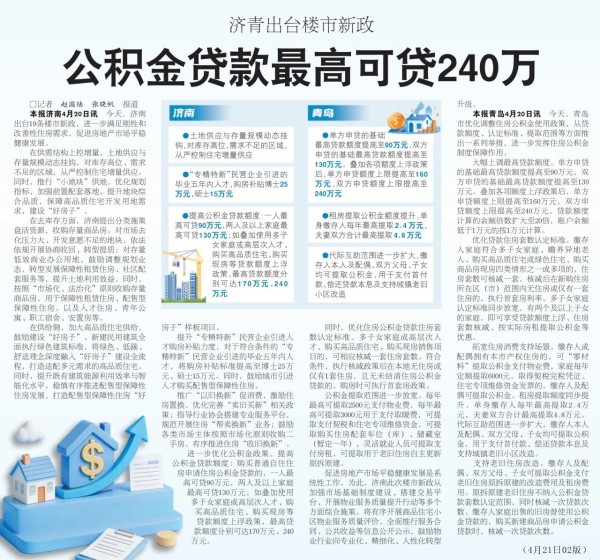 4月20日,山东房地产市场的日历翻开了极具分量的一页。这一天,省会济南与龙头青岛不约而同地出台房地产新政。济南市住建局等六部门发布《关于进一步促进房地产市场平稳健康发展若干政策措施的通知》,围绕控增量、去库存、优供给、促消费等7个方面推出19条实招;青岛市则从贷款额度、认定标准、提取范围、城市更新等方面打出公积金惠民安居“组合拳”。